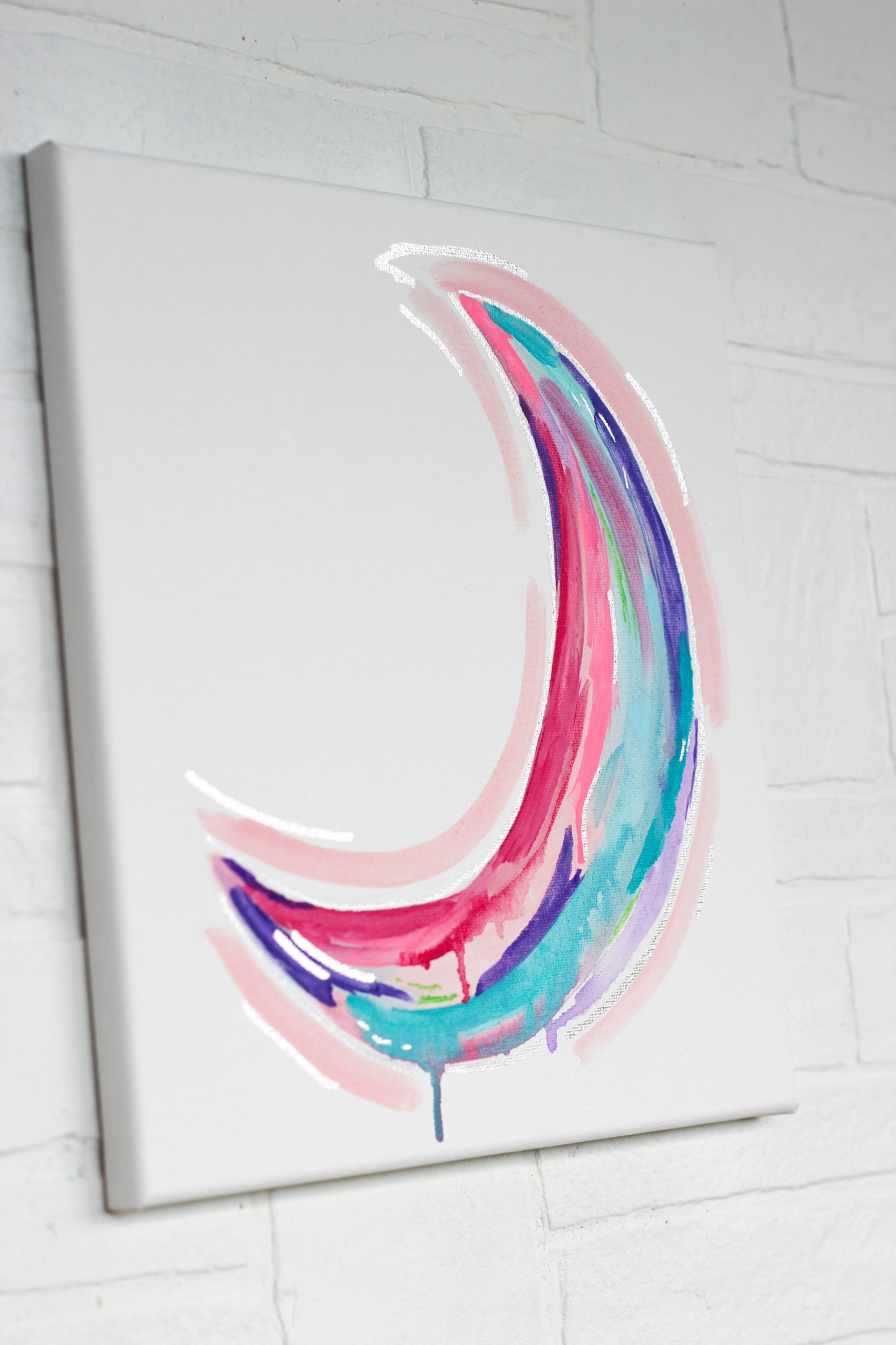 Original Trippy Drippy Crescent Moon on 12x12” canvas featuring bright colors and hand embellished silver lining.