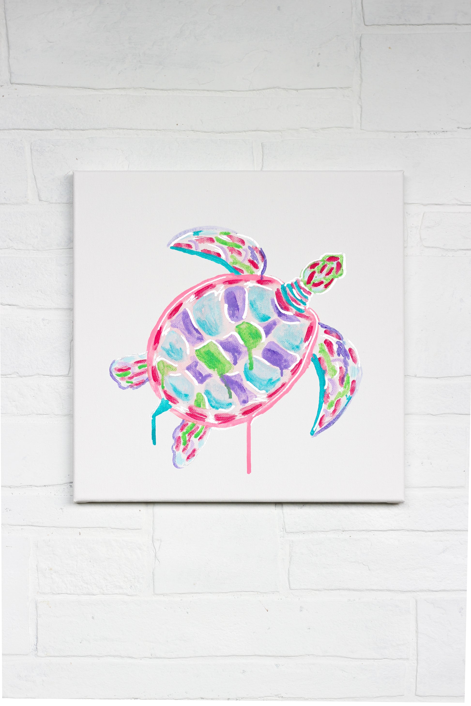 Original Trippy Drippy Turtle on 12x12” canvas featuring bright colors and hand embellished silver lining.