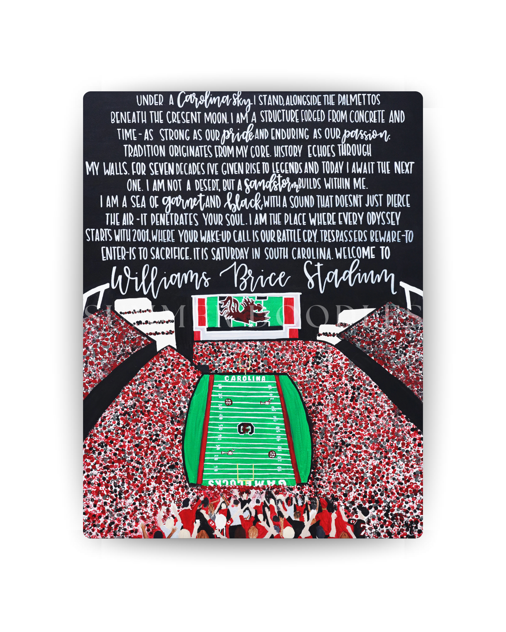 11x14” Print of the best selling Willy B is the perfect gift for any die hard Gamecock! The iconic Williams Brice Stadium is set under the 2001 saying… transforming you into the stadium on a Saturday night in South Carolina.